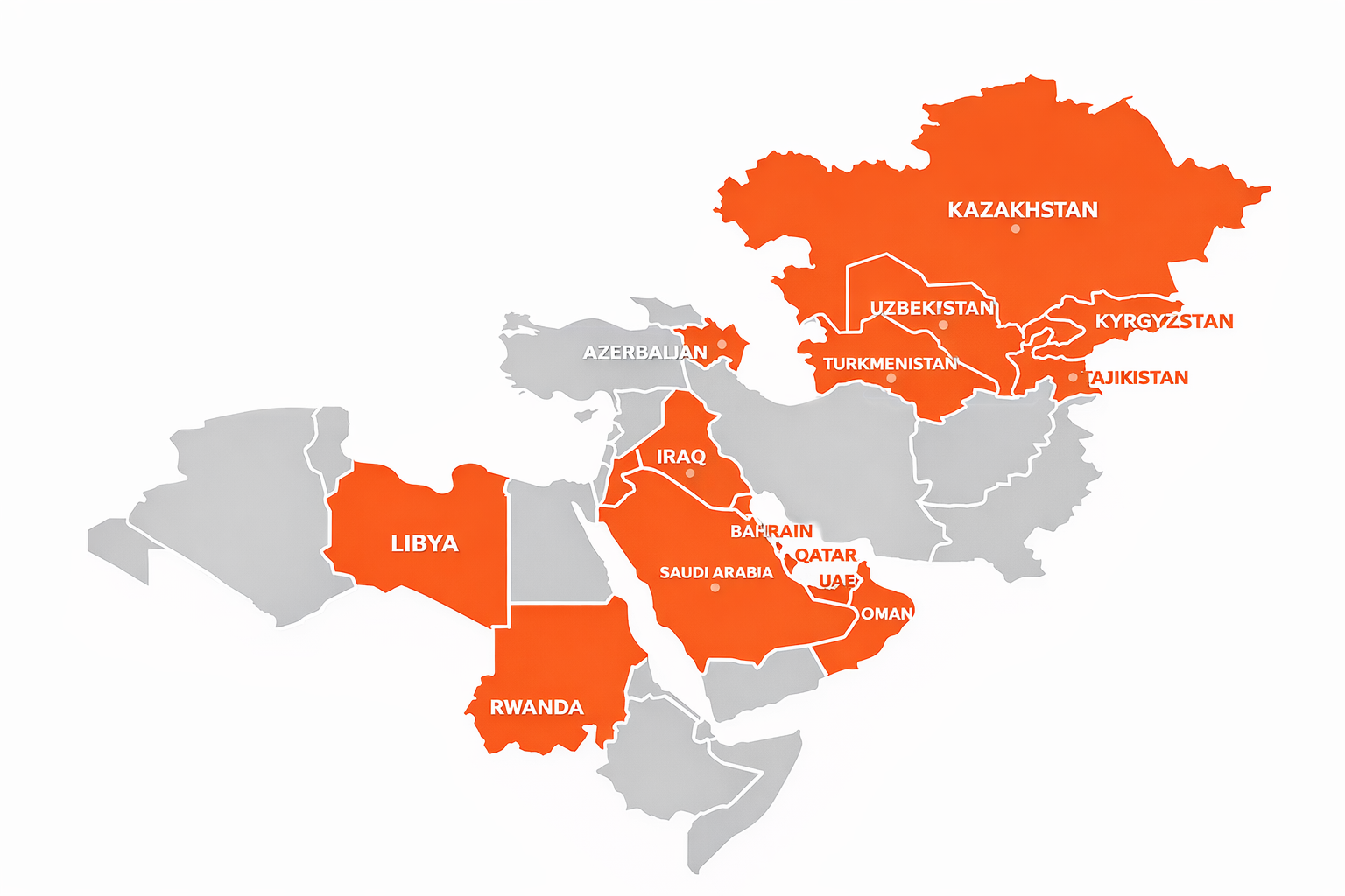 Our global delivery network ensures your goods arrive on time, every time, proudly serving clients across multiple regions and industries with reliable logistics and supply solutions, including the Middle East and Gulf countries; United Arab Emirates, Saudi Arabia, Qatar, Bahrain, Oman and Iraq, North Africa with Libya and Rwanda, Central Asia covering Kazakhstan, Uzbekistan, Turkmenistan, Kyrgyzstan and Tajikistan, as well as the Caucasus region with Azerbaijan, providing seamless, continent-spanning service and complete peace of mind with every shipment.